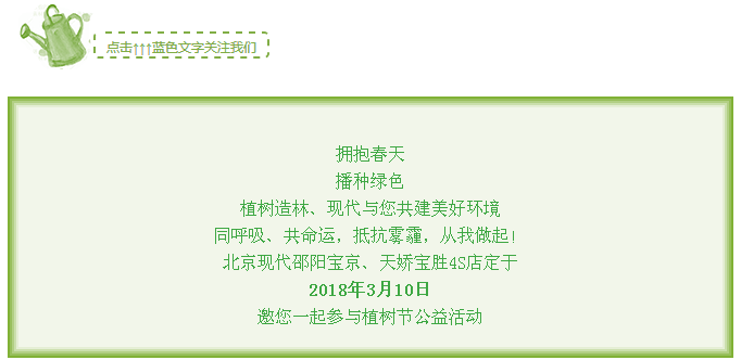 趕緊帶上家人、孩子加入北京現代邵陽寶京、天嬌寶勝4S店舉行的綠色家園植樹自駕游活動吧!