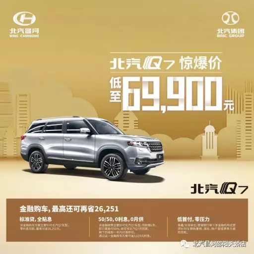 比如你現(xiàn)在購買一臺北汽Q7,這款車目前全系最高優(yōu)惠18000元,起步價僅需6.99萬元。你可以選擇北汽Q7專屬金融方案——“50/50,0利息,0月供”貸款購買。首付僅需3.5萬元,不需要利息和月供,一年后再付清剩下的尾款即可。這樣你不止可以提前享受有車生活,提高家庭的生活品質,也讓銀行承擔了你的人民幣貶值損失,豈不快哉?