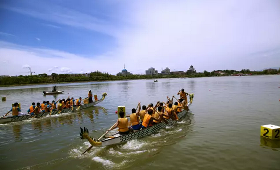 鼓聲三下紅旗開,兩龍躍出浮水來。棹影斡波飛萬劍,鼓聲劈浪鳴千雷。賽龍舟是端午節的習俗之一,起源可追溯至戰國。