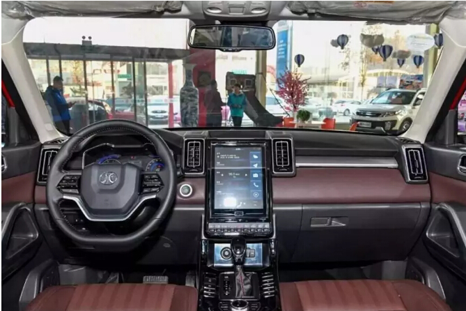 內(nèi)飾的材質(zhì)和設(shè)計(jì)倒是配得上車型的名稱和外觀,因?yàn)槲覀冊谲噧?nèi)能看到皮質(zhì)包裹的前臺,超大中控屏幕,寬厚的擋把區(qū)等實(shí)力元素,還有就是空調(diào)出風(fēng)口漢字造型霸氣十足。