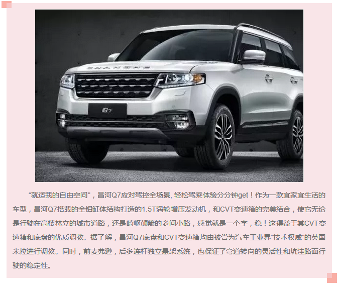憑借全能又多變的產品力優勢,昌河Q7不僅能夠滿足時下消費者注重的個性化需求,又能完美兼顧不同生活場景的應用,用其全適應、全場景的定位拓展了人們對于SUV認知的邊界,展示了SUV車型未來的發展風向,那就是人、車、生活的完美統一和無縫結合?!熬瓦m我的”Q7,就是我的生活,這就是昌河Q7想要帶給互聯網時代下年輕一代的未來移動生活方式。