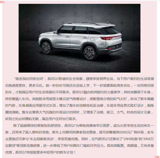 面對時代變革的新趨勢,昌河汽車以用戶需求為原點,以移動出行辦公需求和移動出行娛樂需求為突破點,打造出了一系列重點車型。昌河汽車“敢創同行”戰略發布會同步上市全新車型——北汽昌河Q7,是其2018年新戰略方向下的重磅戰略車型。