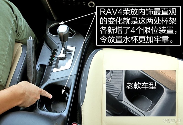 拋開配置差異帶來的不同,新款RAV4榮放在前排杯架的處理上更加用心,兩處杯架各新增了限位裝置,放置高位的水瓶或是比較細的水瓶都變得更加牢靠,同時也降低異響發生的可能。