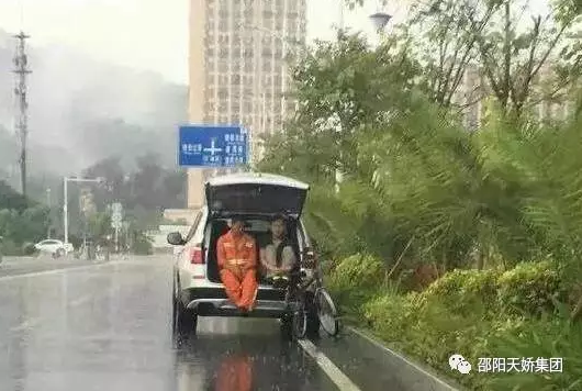 大雨中,一位好心的小伙開車路過,發(fā)現(xiàn)環(huán)衛(wèi)工人沒有地方躲雨,就主動邀請雨中的環(huán)衛(wèi)工人上車避雨。環(huán)衛(wèi)工人怕自己弄臟車子,不肯答應(yīng),后來小伙子就和他一起在后備箱里避雨。