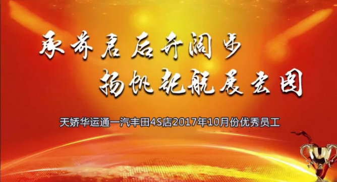 銀色的十月已過去,輝煌的十一月悄然來臨,時間晃晃而過已是2017年11月11日,天嬌華運通一汽豐田4S店每月一次的總結優秀員工表彰大會如期而至。